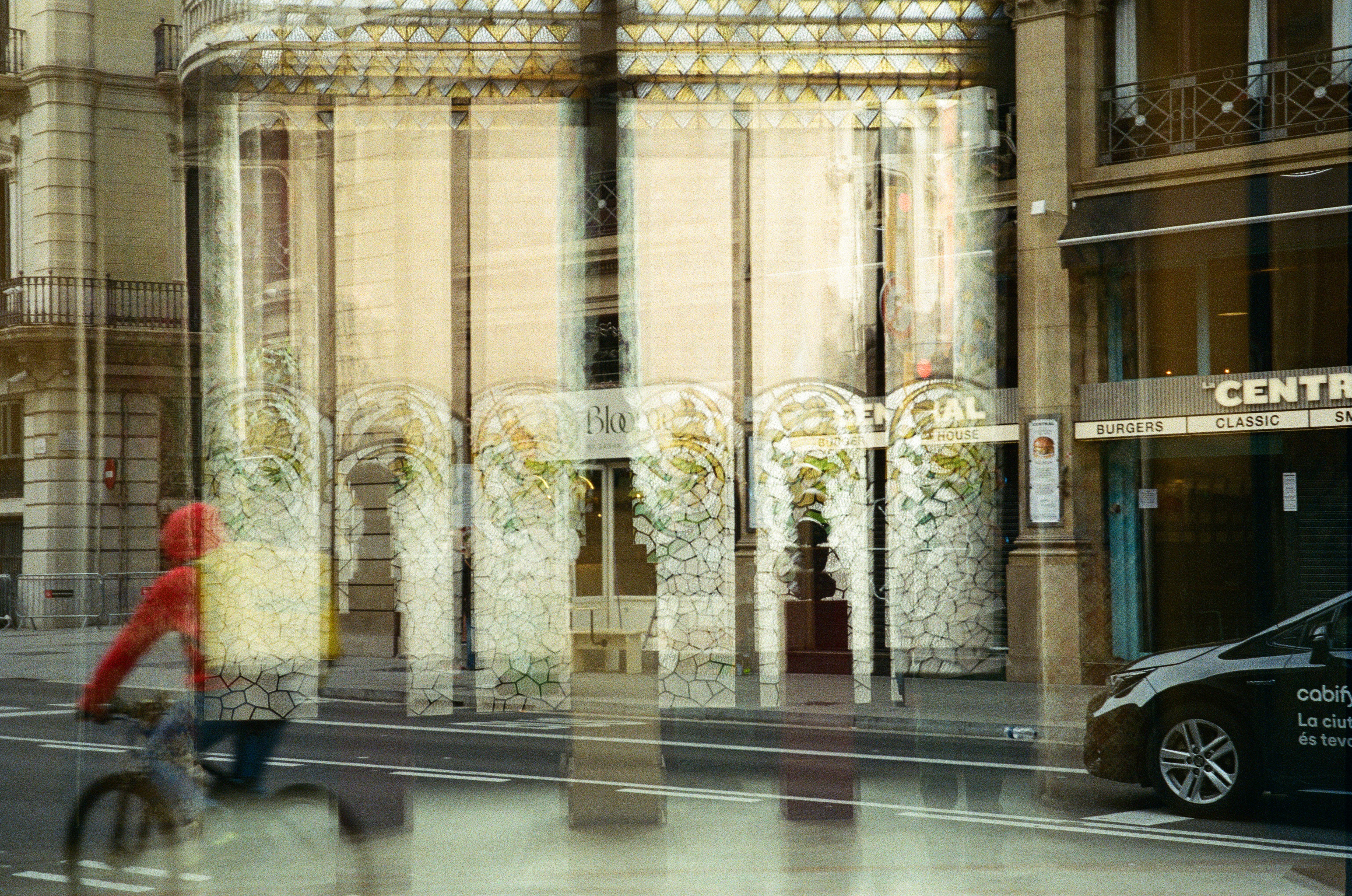 이중노출된 사진. 바르셀로나 거리 모습과 카탈라냐 음악당 실내 모습이 함께 찍힌 모습니다. 빨간색 옷을 입고 자전거를 탄 분 덕분에 사진에서 생동감이 느껴진다.